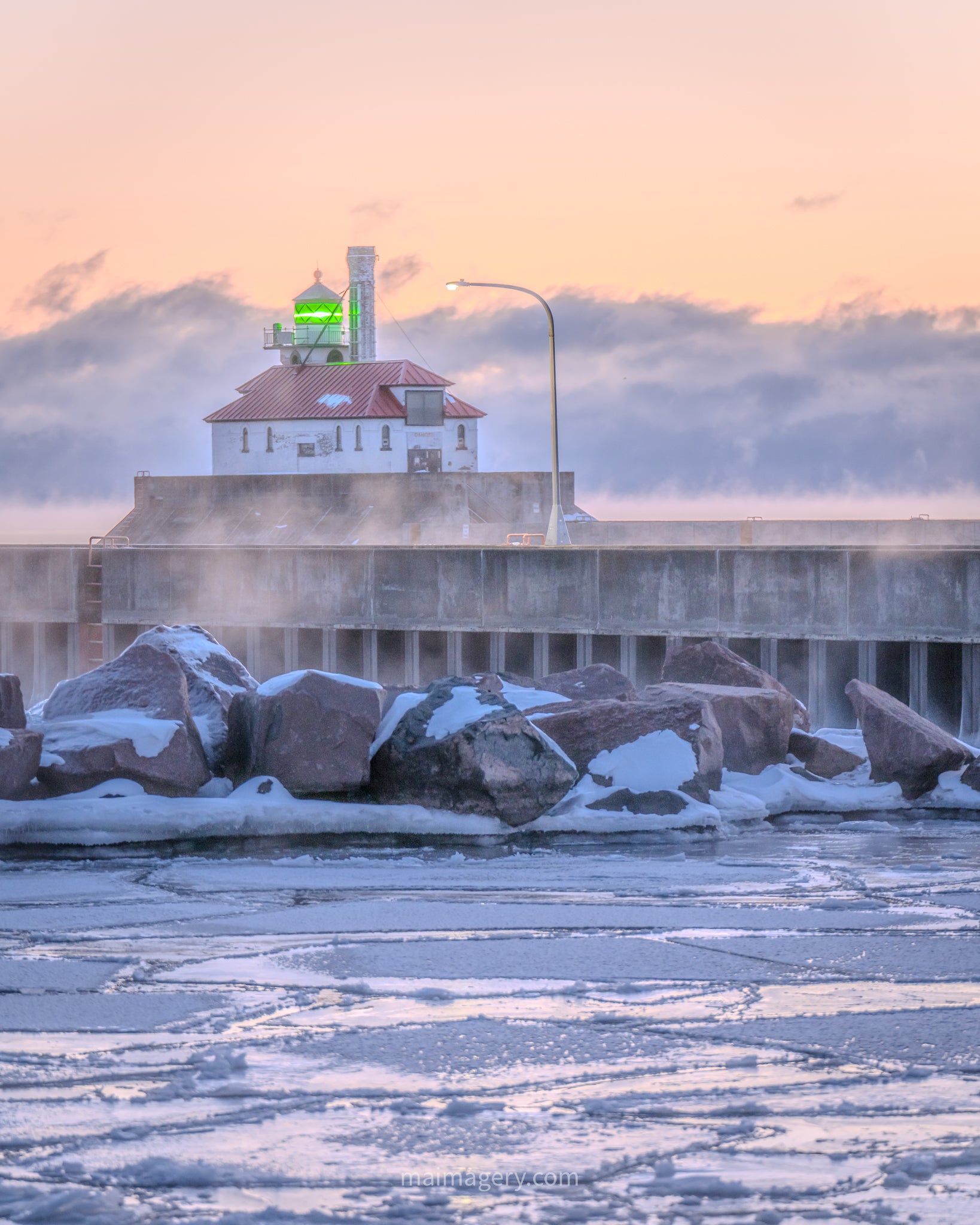 Frosted pancake ice slabs near a frozen Duluth South Pier Lighthouse on a -4° morning with a menacing wall of sea smoke lingering in the distance.